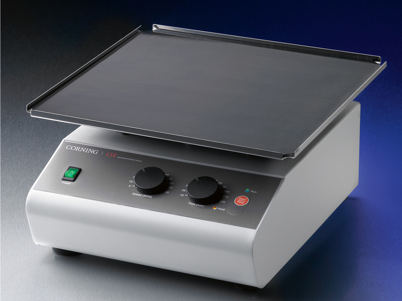 The Corning LSE Low Speed Orbital Shaker includes a 30 x 30 cm platform and is ideal for staining and destaining gels, washing blots and general mixing applications. Speed can be set from 3 to 60 rpm and the timer can be set for up to 2 hours or for continuous operation. · Ideal for staining and washing of fragile gels · Gentle motion prevents foaming of liquids · Simple analog control with easy-turn knobs · 19mm orbit for blotting, gel staining and general mixing · Safe for cold room and incubator use