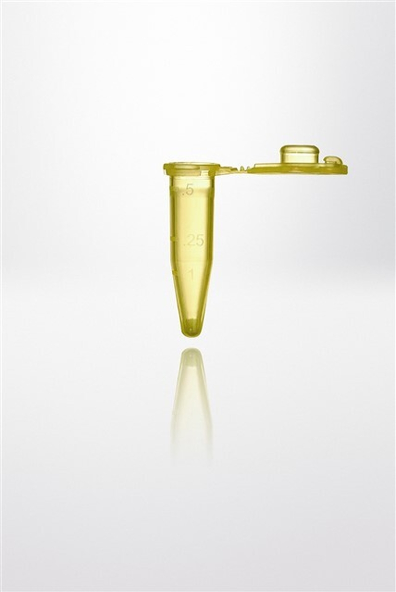 np Safelock-Cap microcentrifuge tube PP, 0,5ml, attached cap, boil-proof, yellow, grad., writing area, np pcr ready, max. RCF 30.000g, autocl. up to 121°C, CE/IVD