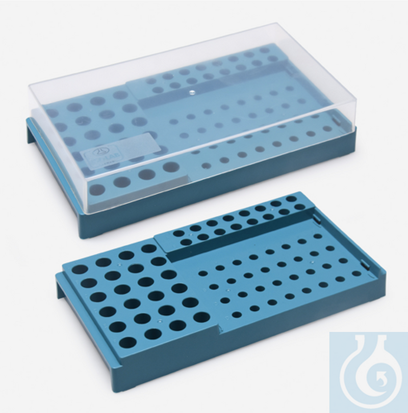 Fully autoclavable. This storage/working rack, with lid, is designed to work with different PCR volumes at the same time. It can accommodate up to 32 individual 0.2 ml PCR tubes, 24 pieces of 1.5/2.0 ml and 16 pieces of 0.5 ml microtubes. Tube wells are alpha-numerically matrixed with raised bold type for accurate sample identification. The rack also has a transparent lid for easy viewing of samples. Frosted writing panels on four sides allow labelling or writing.